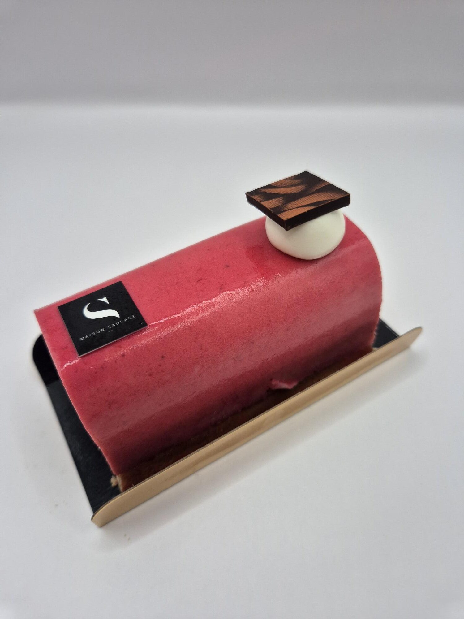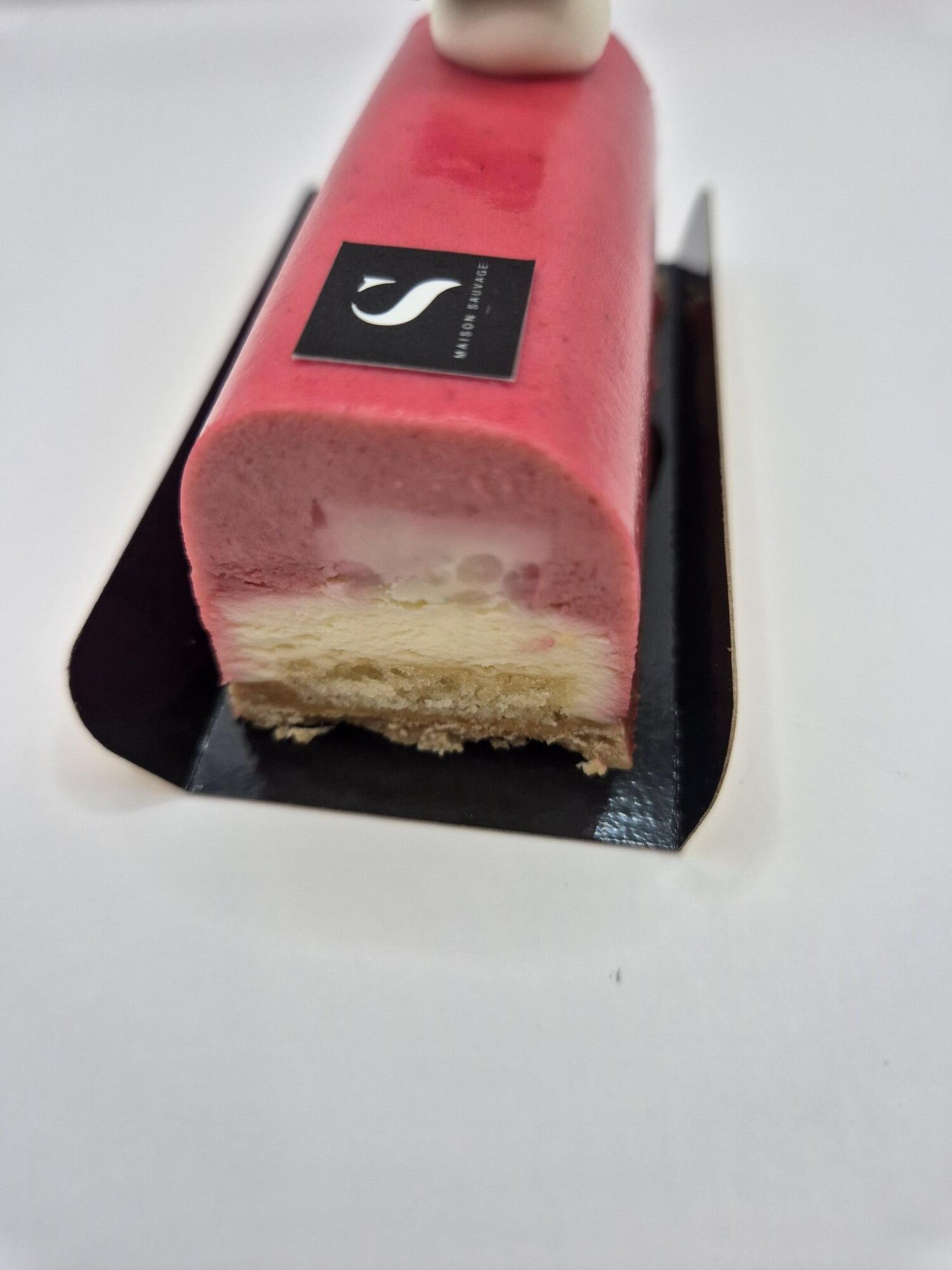 Perle de Givre séduit par ses contrastes de textures et de saveurs : un biscuit madeleine citron moelleux, un crumble croustillant, une mousse framboise fruitée, un cœur de riz au lait vanillé et une crème légère au citron pour une touche de fraîcheur.