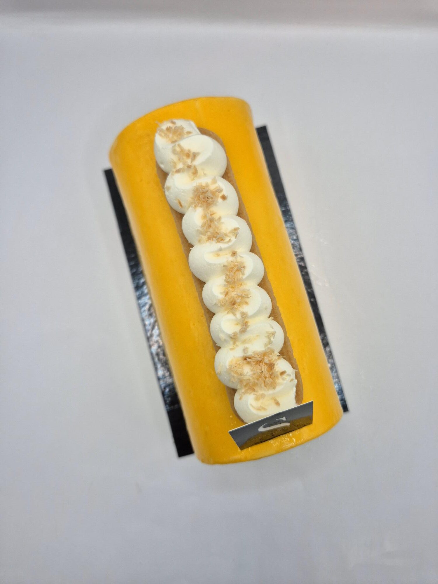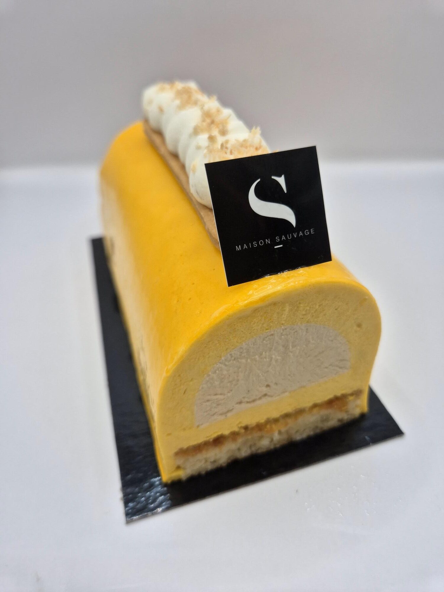 Laissez-vous emporter par l’Étoile des Tropiques, une bûche légère et envoûtante alliant la douceur d’un biscuit congolais, la fraîcheur d’une mousse mangue-passion et la gourmandise d’un crémeux caramel, le tout sublimé par un glaçage délicat sans chocolat ni gluten.