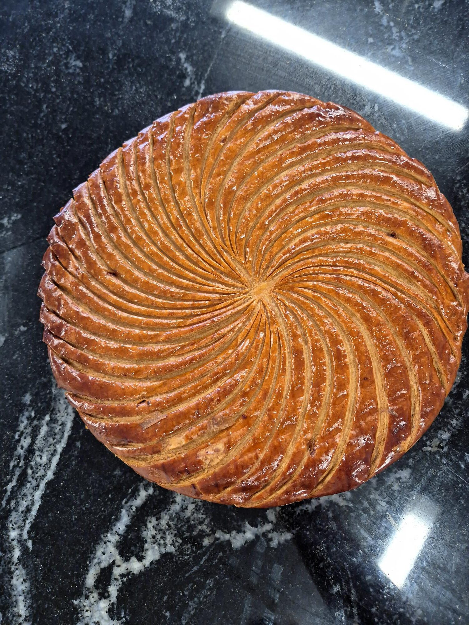 Notre galette frangipane, réalisée avec un feuilletage pur beurre doré et une crème d’amande onctueuse, offre une gourmandise authentique aux saveurs traditionnelles.