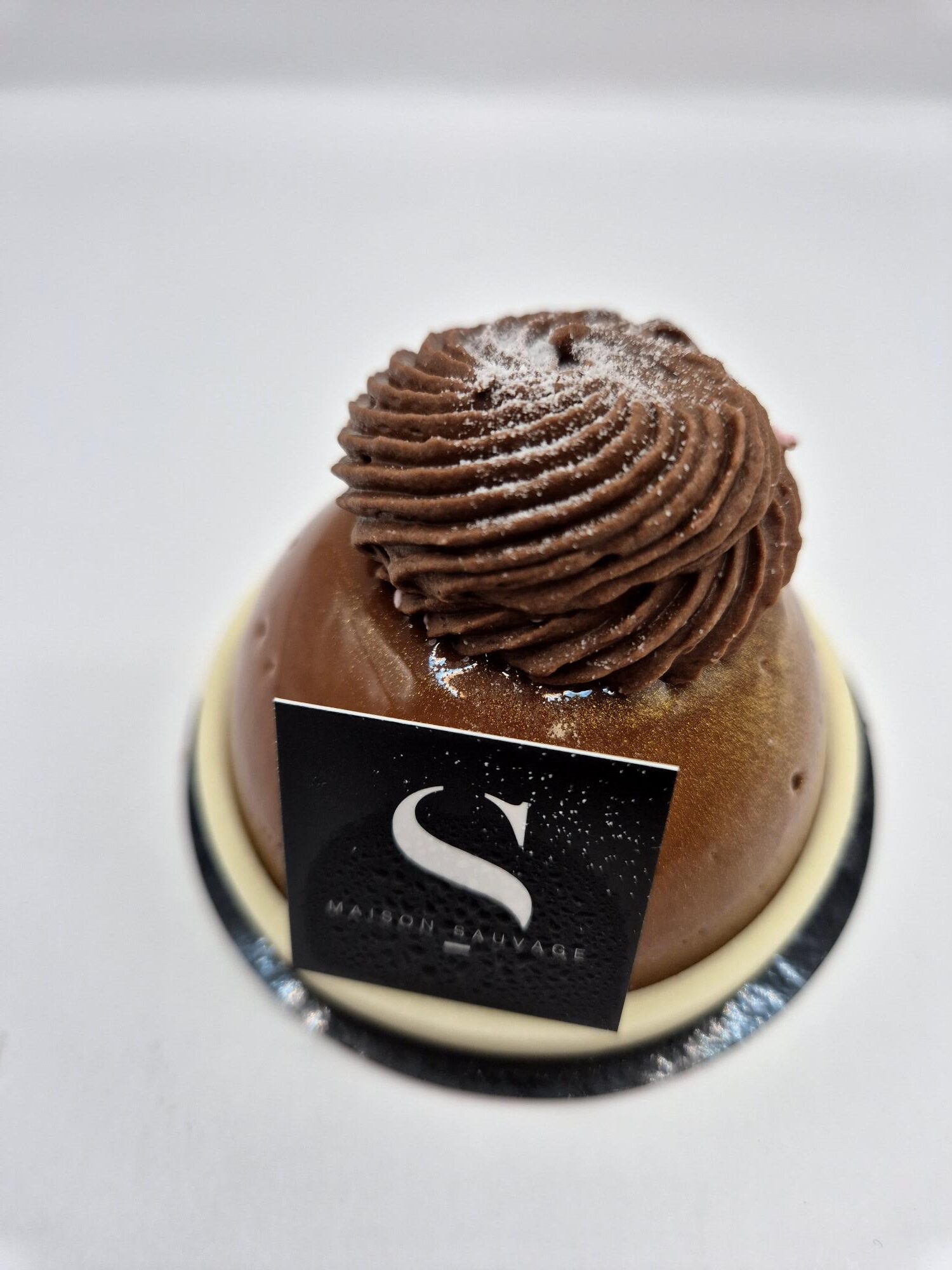 La Sphère d’Or révèle un biscuit aux amandes délicat, un croustillant praliné fondant, une mousse au chocolat noir intense et un cœur de crème brûlée vanille pour une expérience gourmande et raffinée.