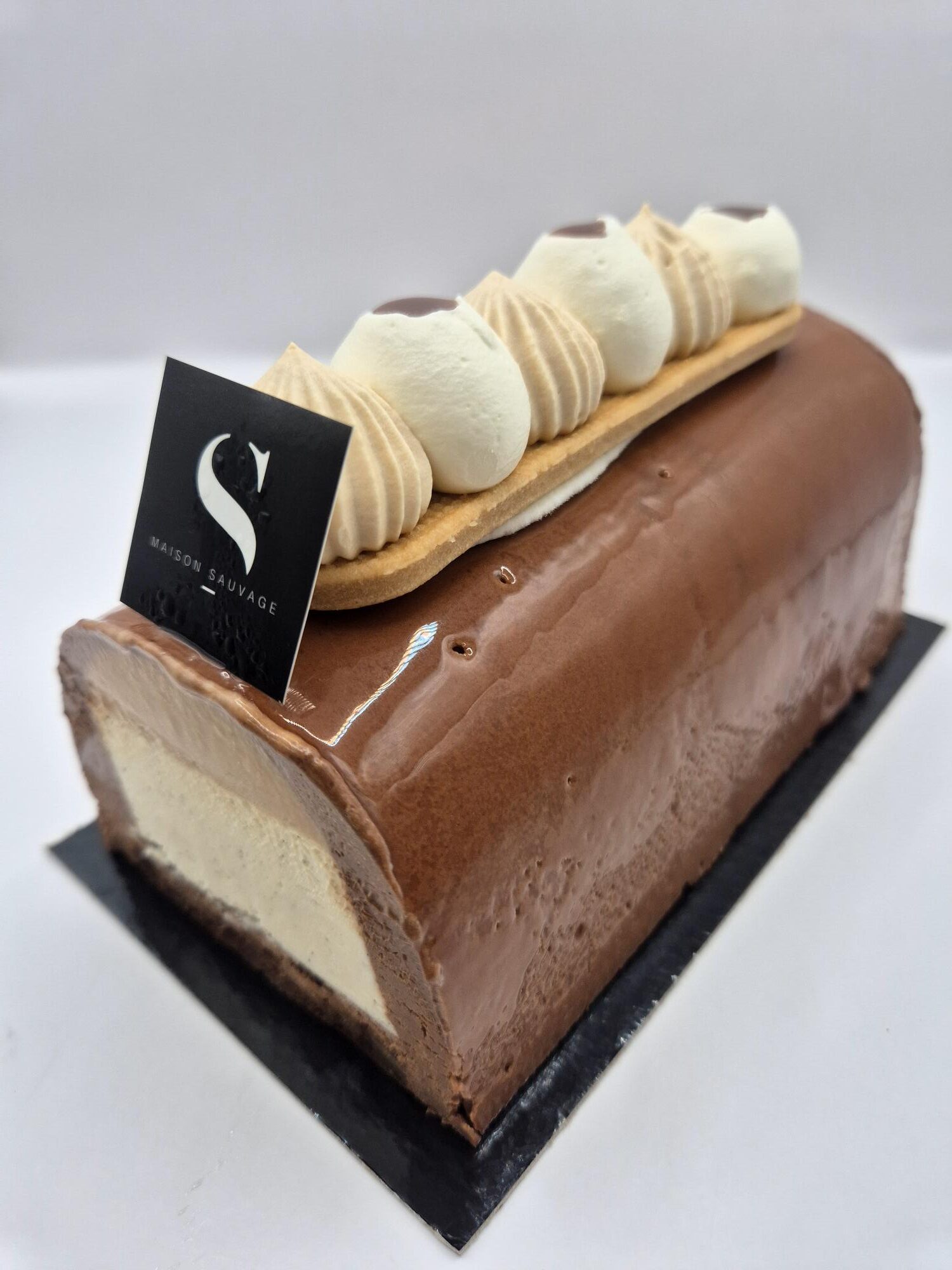 Velours Noir allie intensité et douceur : un biscuit brownie aux noix fondant, une mousse au chocolat noir d’une profondeur envoûtante, un insert de caramel beurre salé et une mousse vanille onctueuse pour une touche de légèreté.