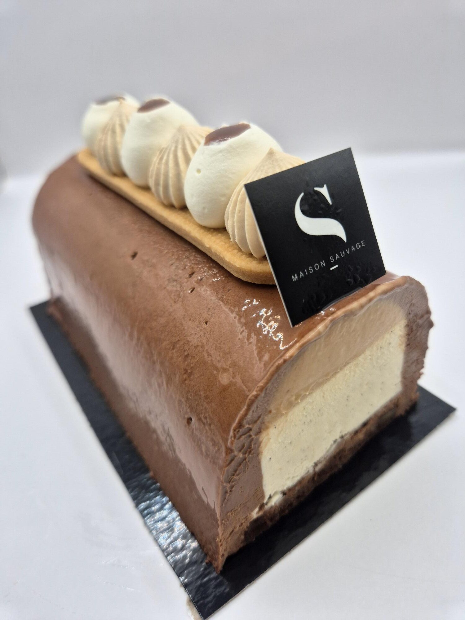 Velours Noir allie intensité et douceur : un biscuit brownie aux noix fondant, une mousse au chocolat noir d’une profondeur envoûtante, un insert de caramel beurre salé et une mousse vanille onctueuse pour une touche de légèreté.