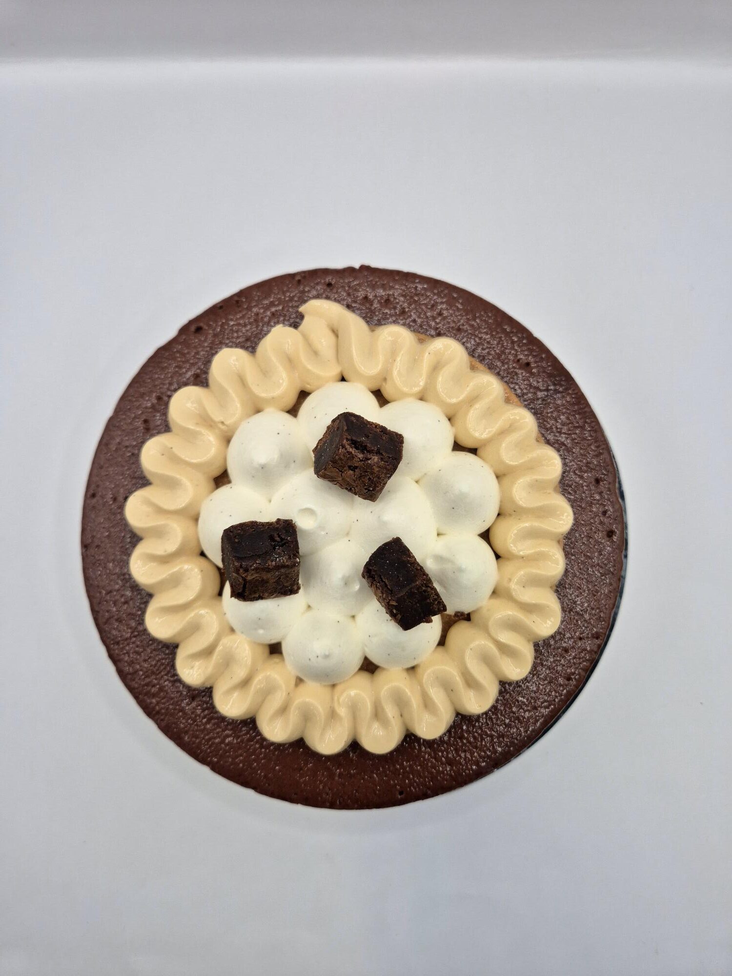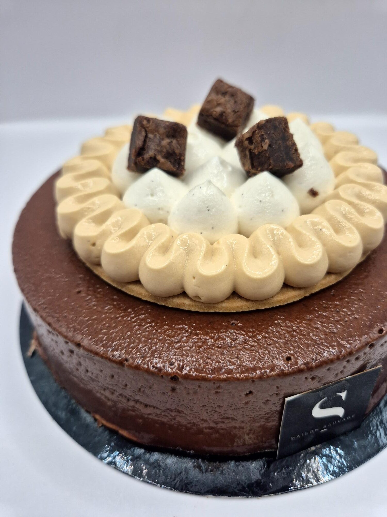 Découvrez VELOUR, une création tout en douceur et en intensité : un biscuit brownies fondant, surmonté d’une mousse vanille légère, d’une mousse au chocolat noir intense, et d’un cœur coulant d’insert caramel beurre salé. Une harmonie parfaite entre gourmandise et élégance.